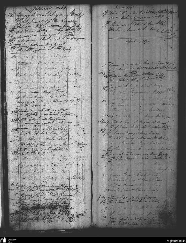 Tullamore; County of Offaly, Westmeath; Diocese of Meath. Marriages, Jan. 1840 to July 1840