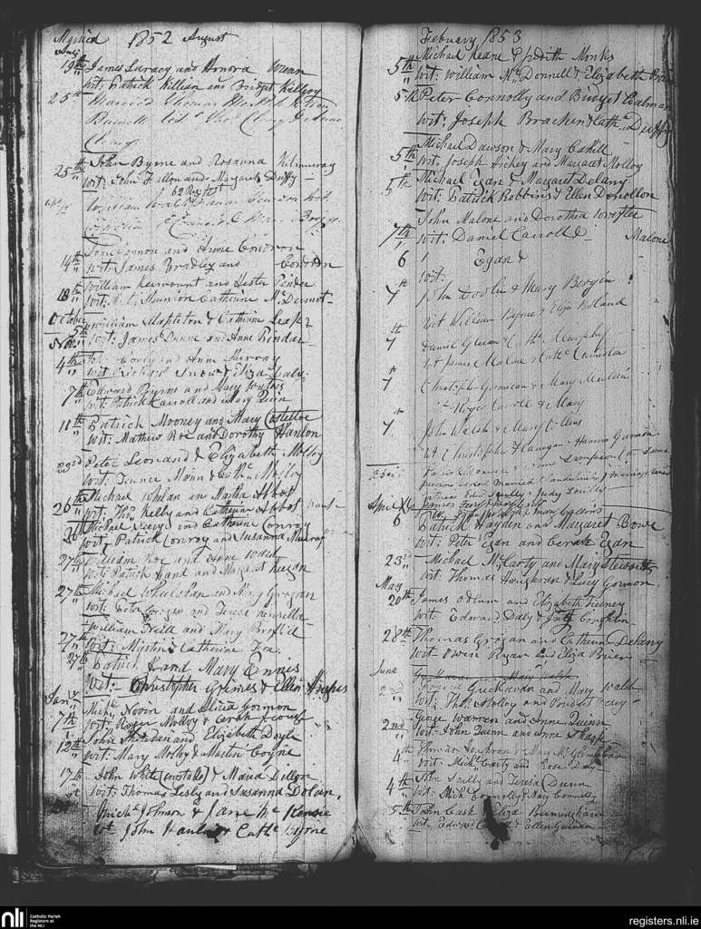 Tullamore; County of Offaly, Westmeath; Diocese of Meath. Marriages, Aug. 1852 to June 1853