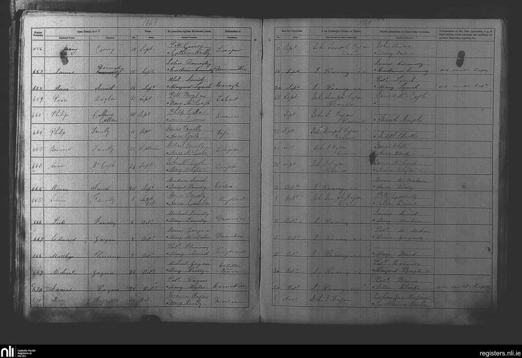 Kingscourt; County of Cavan, Meath; Diocese of Meath. Baptisms, Sep. 1868 to Nov. 1868