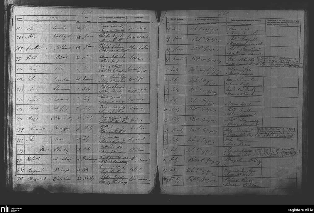 Kingscourt; County of Cavan, Meath; Diocese of Meath. Baptisms, June 1869 to July 1869