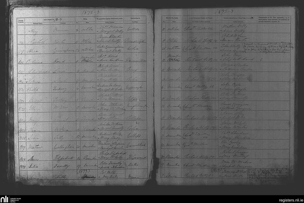Kingscourt; County of Cavan, Meath; Diocese of Meath. Baptisms, Oct. 1872 to Jan. 1873