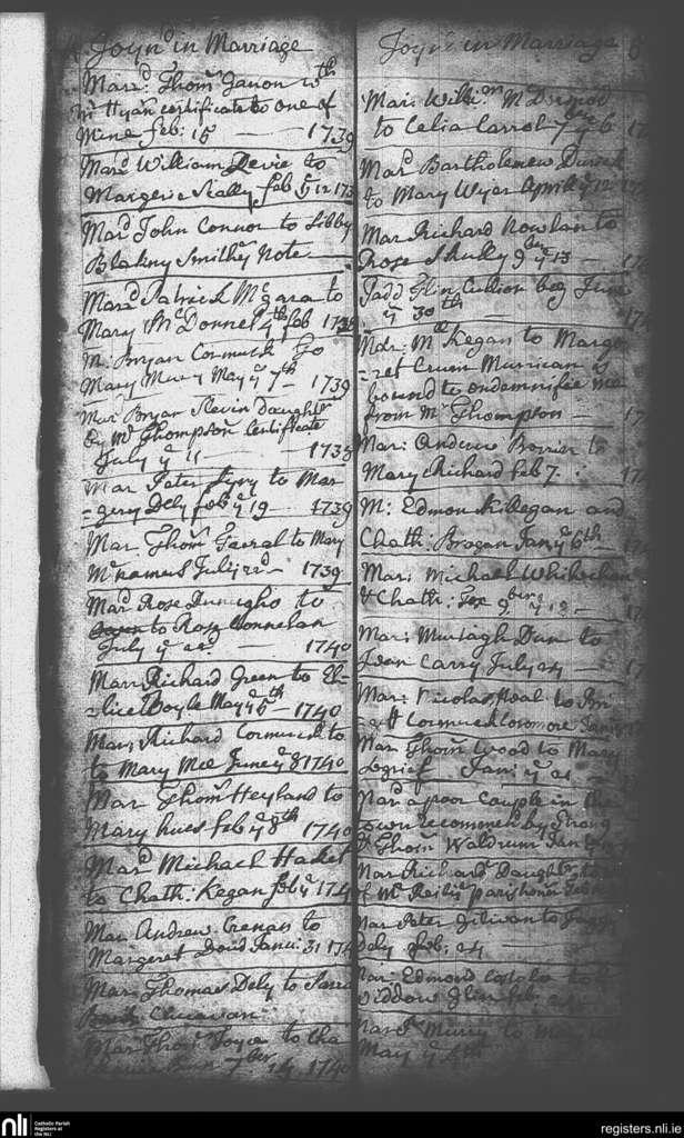 Mullingar; County of Westmeath; Diocese of Meath. Marriages, Feb. 1738 to Sep. 1741