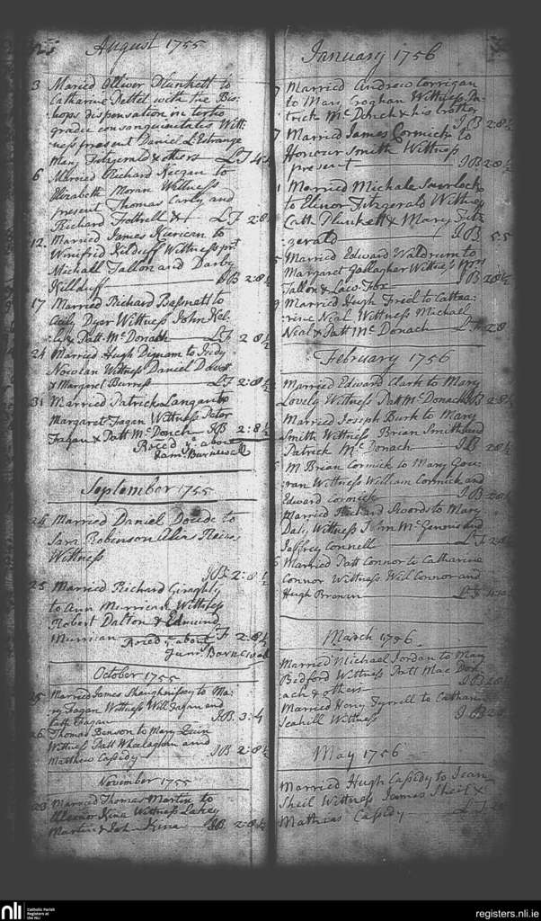Mullingar; County of Westmeath; Diocese of Meath. Marriages, Aug. 1755 to May 1756
