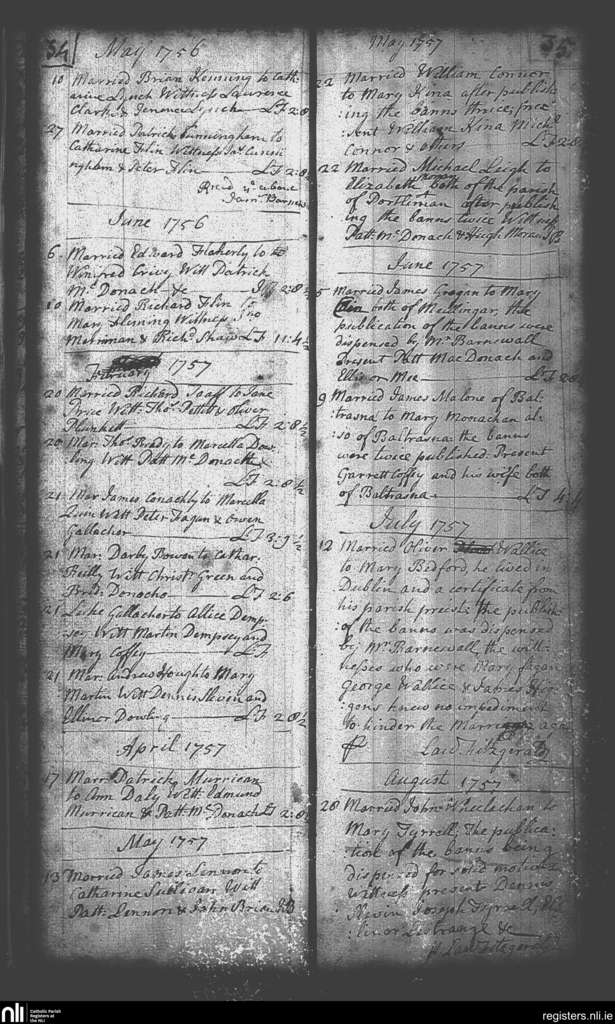 Mullingar; County of Westmeath; Diocese of Meath. Marriages, May 1756 to Aug. 1757