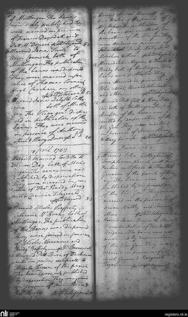 Mullingar; County of Westmeath; Diocese of Meath. Marriages, Feb. 1763 to June 1763