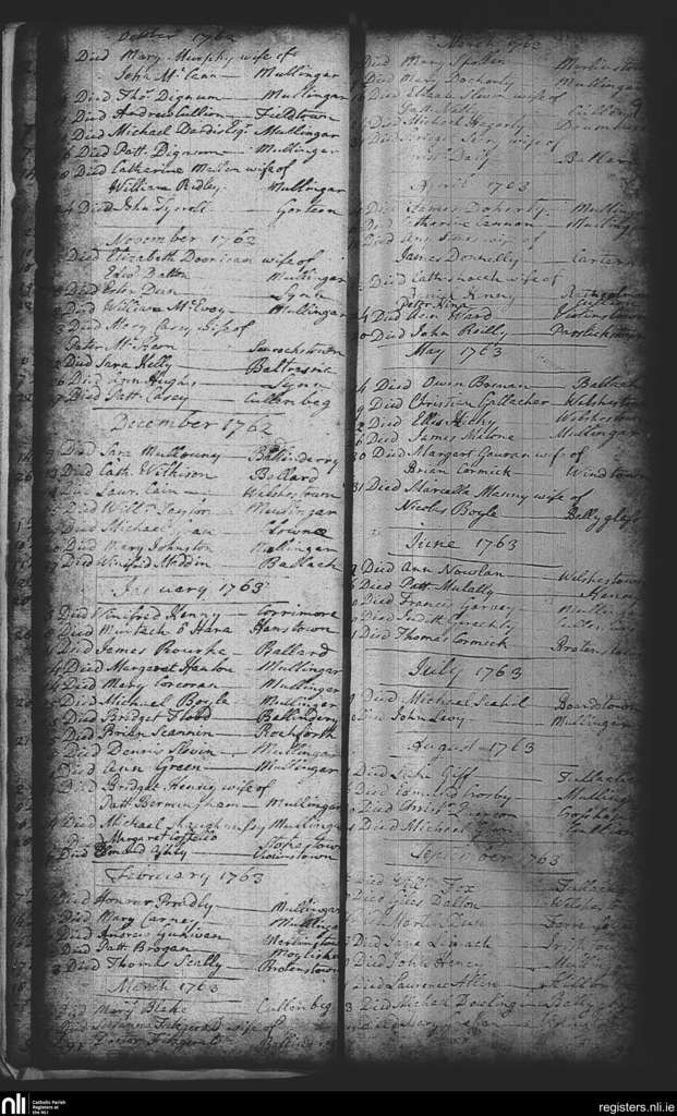 Mullingar; County of Westmeath; Diocese of Meath. Deaths, Oct. 1762 to Sep. 1763