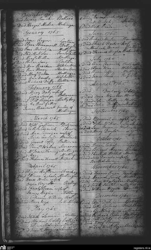 Mullingar; County of Westmeath; Diocese of Meath. Deaths, Dec. 1764 to Dec. 1765
