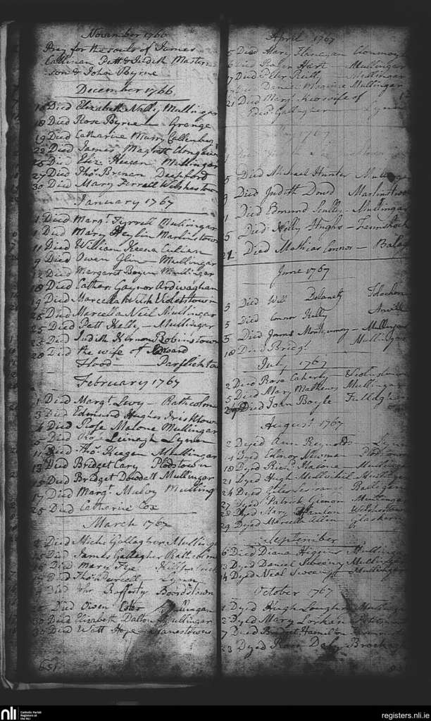 Mullingar; County of Westmeath; Diocese of Meath. Deaths, Nov. 1766 to Oct. 1767