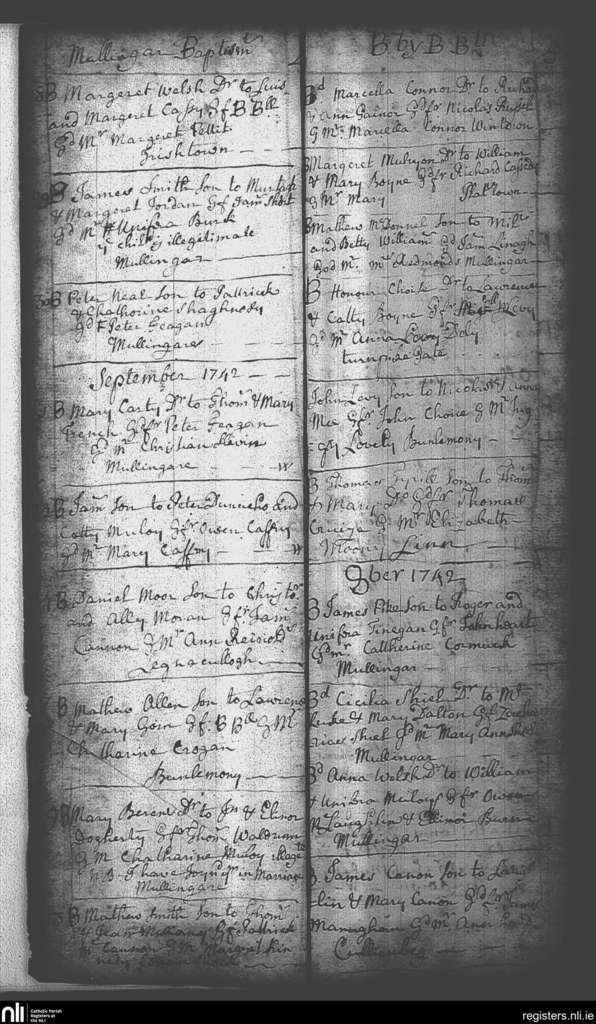 Mullingar; County of Westmeath; Diocese of Meath. Baptisms, Aug. 1742 to Sep. 1742