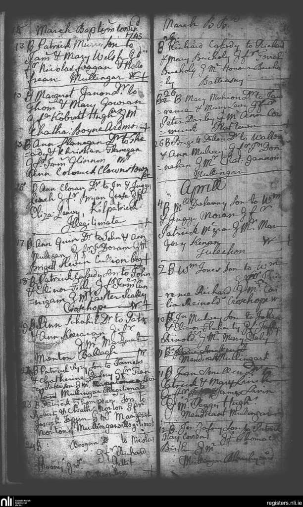 Mullingar; County of Westmeath; Diocese of Meath. Baptisms, Mar. 1743 to Apr. 1743