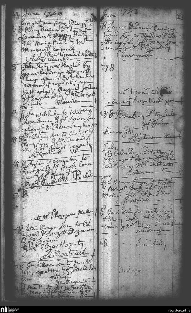 Mullingar; County of Westmeath; Diocese of Meath. Baptisms, June 1743 to July 1743