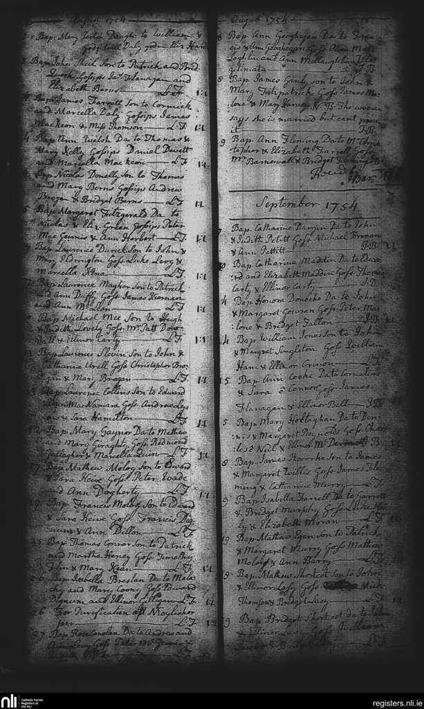 Mullingar; County of Westmeath; Diocese of Meath. Baptisms, Aug. 1754 to Sep. 1754