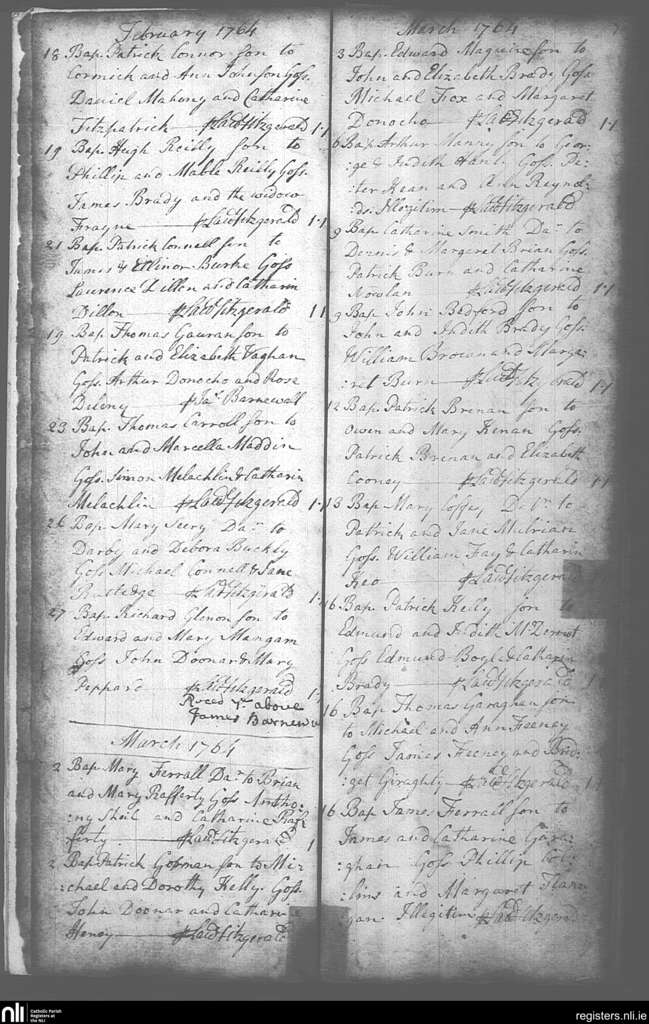 Mullingar; County of Westmeath; Diocese of Meath. Baptisms, Feb. 1764 to Mar. 1764
