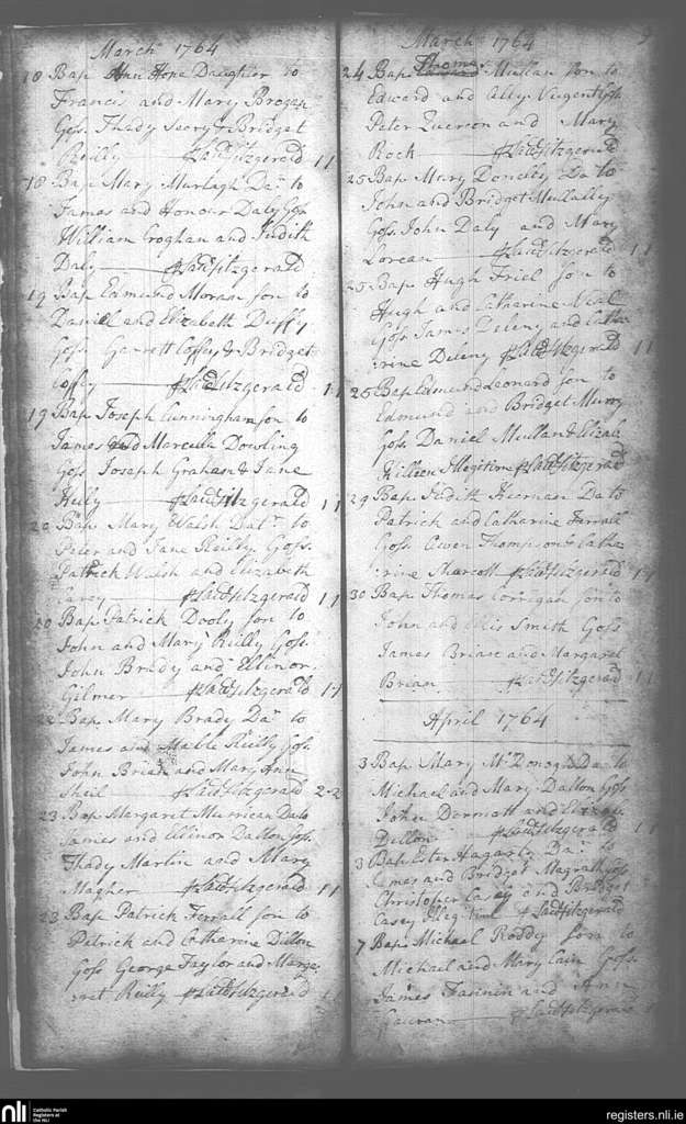Mullingar; County of Westmeath; Diocese of Meath. Baptisms, Mar. 1764 to Apr. 1764
