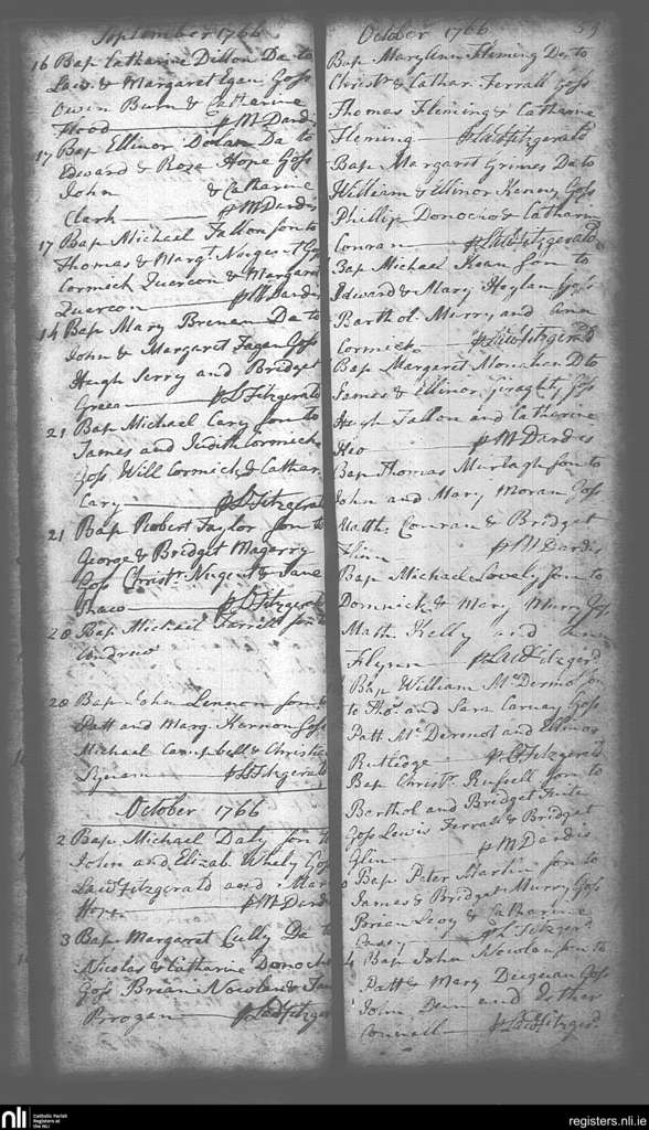 Mullingar; County of Westmeath; Diocese of Meath. Baptisms, Sep. 1766 to Oct. 1766