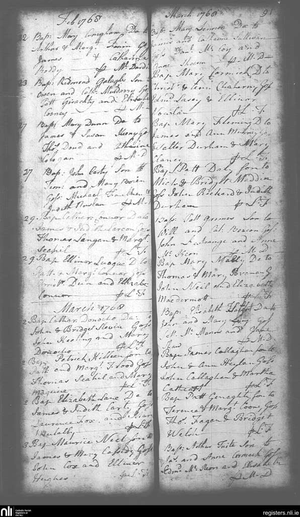Mullingar; County of Westmeath; Diocese of Meath. Baptisms, Feb. 1768 to Mar. 1768