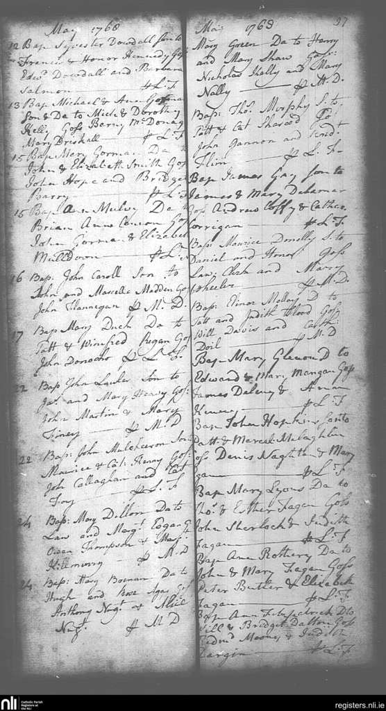 Mullingar; County of Westmeath; Diocese of Meath. Baptisms, May 1768