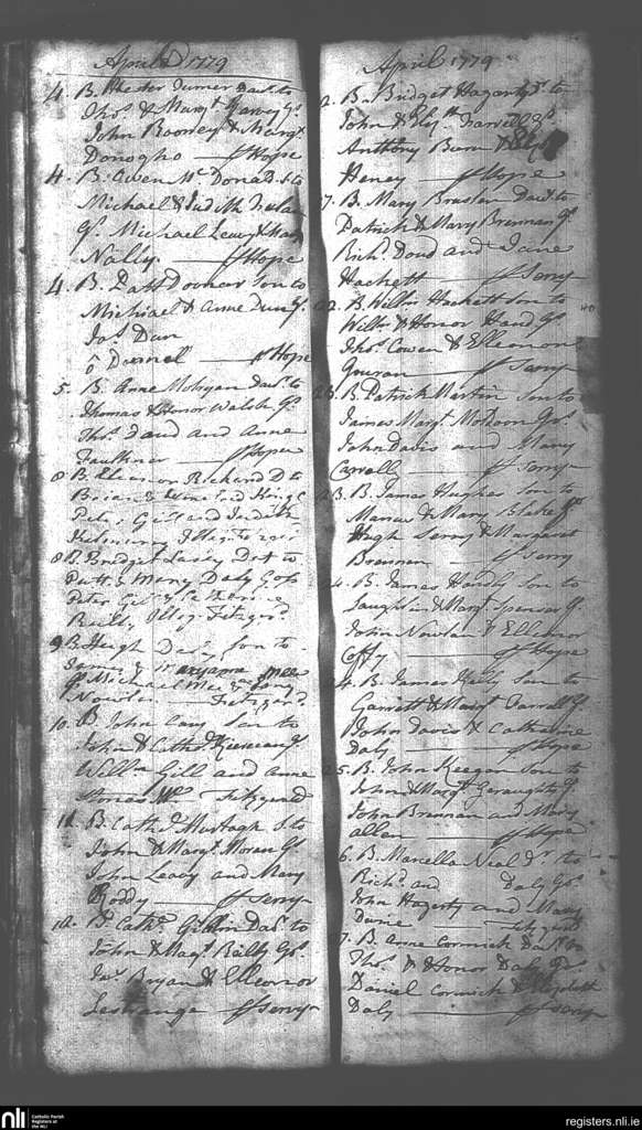 Mullingar; County of Westmeath; Diocese of Meath. Baptisms, Apr. 1779
