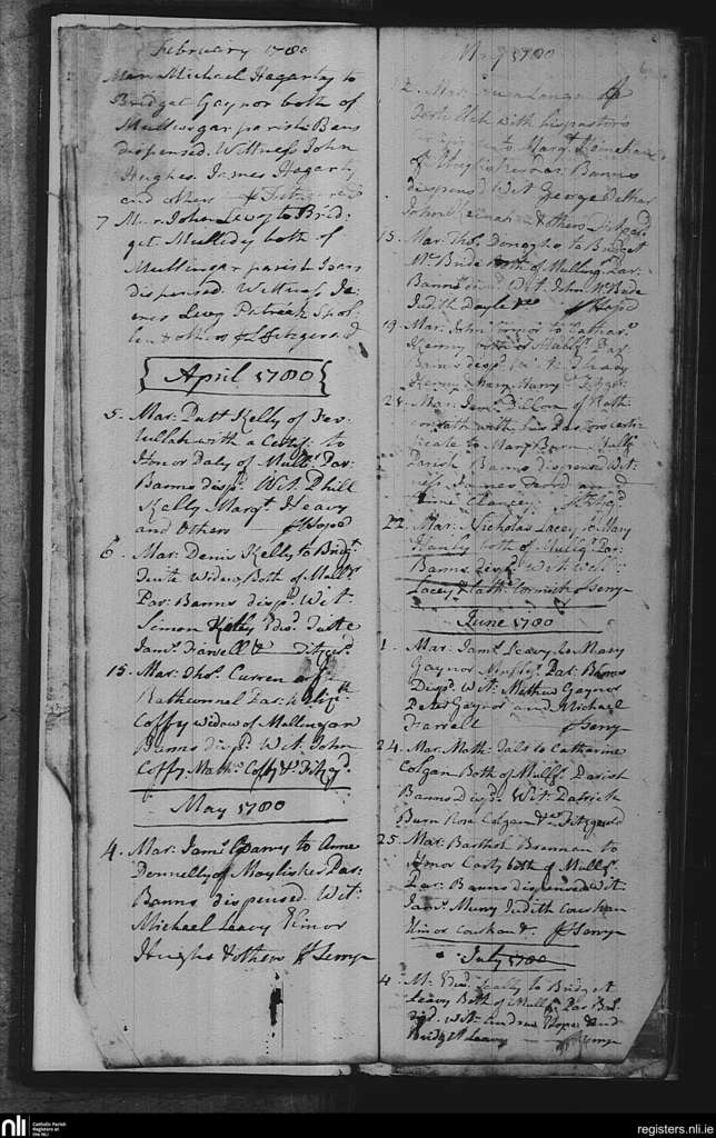 Mullingar; County of Westmeath; Diocese of Meath. Marriages, Feb. 1780 to July 1780