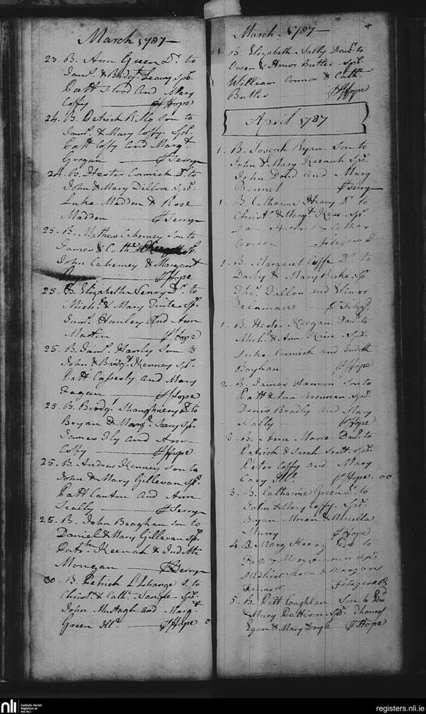 Mullingar; County of Westmeath; Diocese of Meath. Baptisms, Mar. 1787 to Apr. 1787