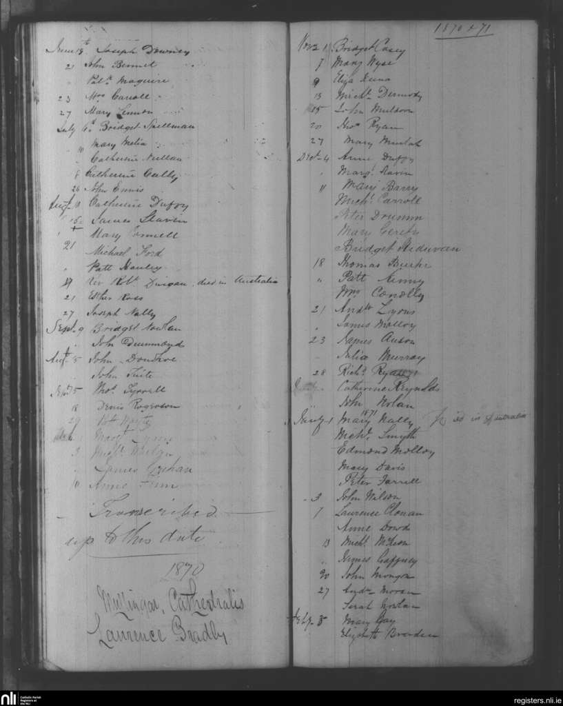 Mullingar; County of Westmeath; Diocese of Meath. Deaths, June 1870 to Feb. 1871