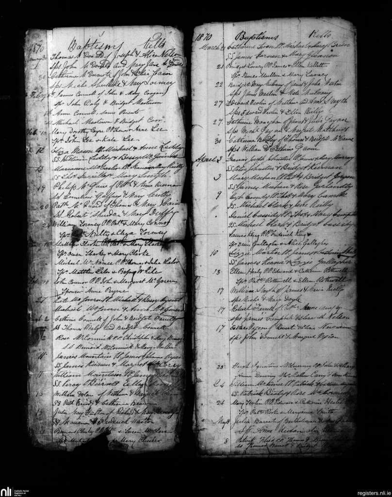 Kells; County of Meath; Diocese of Meath. Baptisms, Jan. 1870 to May 1870