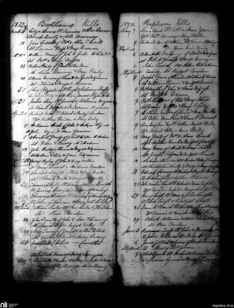 Kells; County of Meath; Diocese of Meath. Baptisms, Mar. 1872 to June 1872