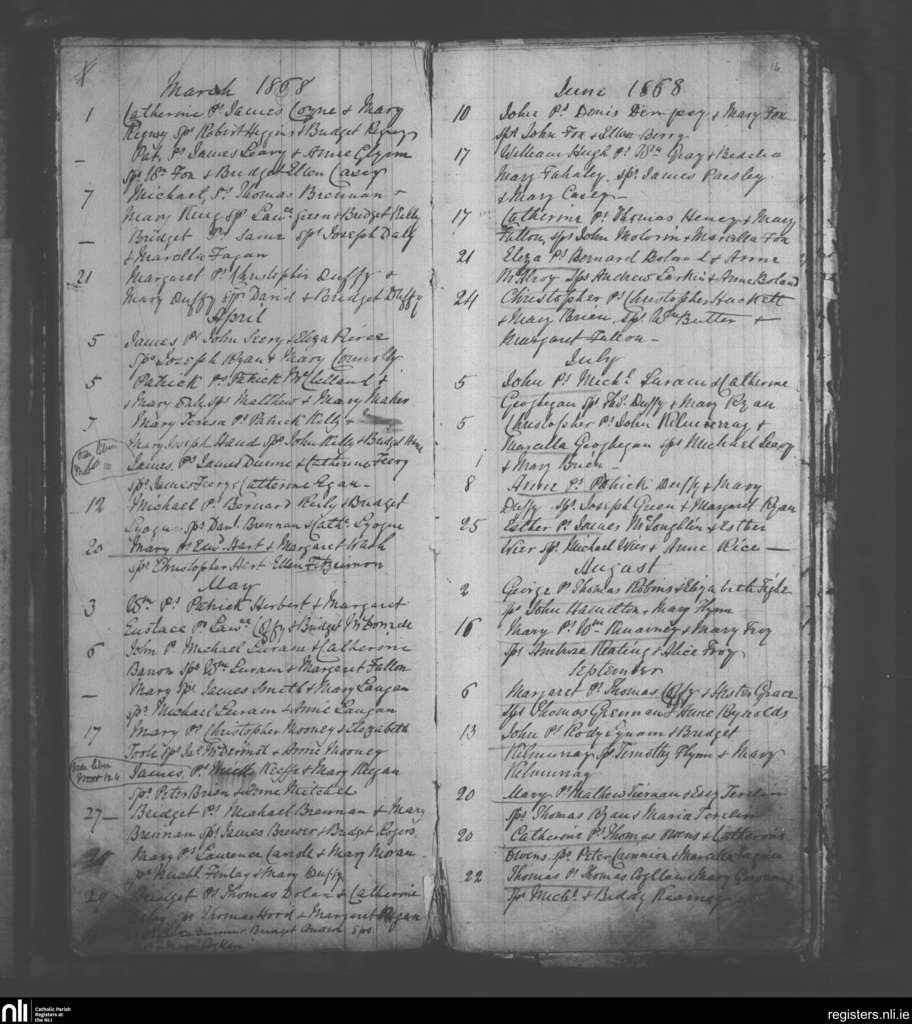Kilbeggan; County of Westmeath; Diocese of Meath. Baptisms, Mar. 1868 to Sep. 1868