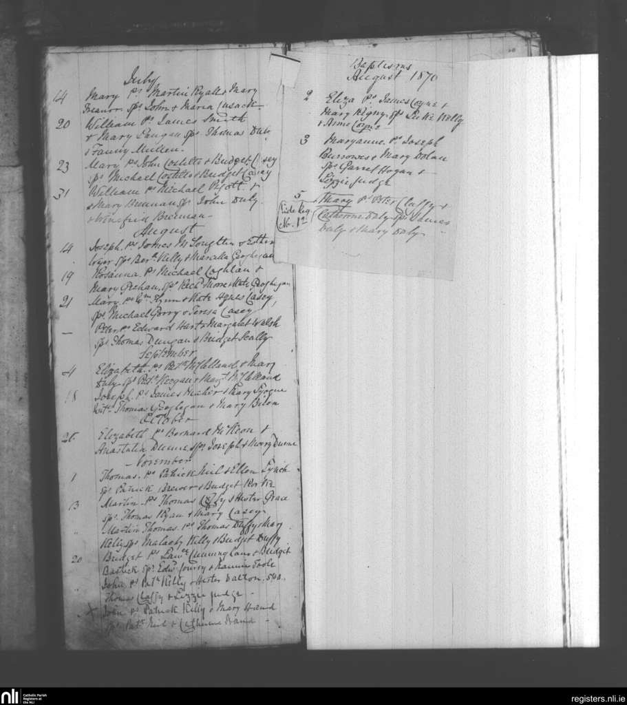 Kilbeggan; County of Westmeath; Diocese of Meath. Baptisms, July 1870 to Nov. 1870