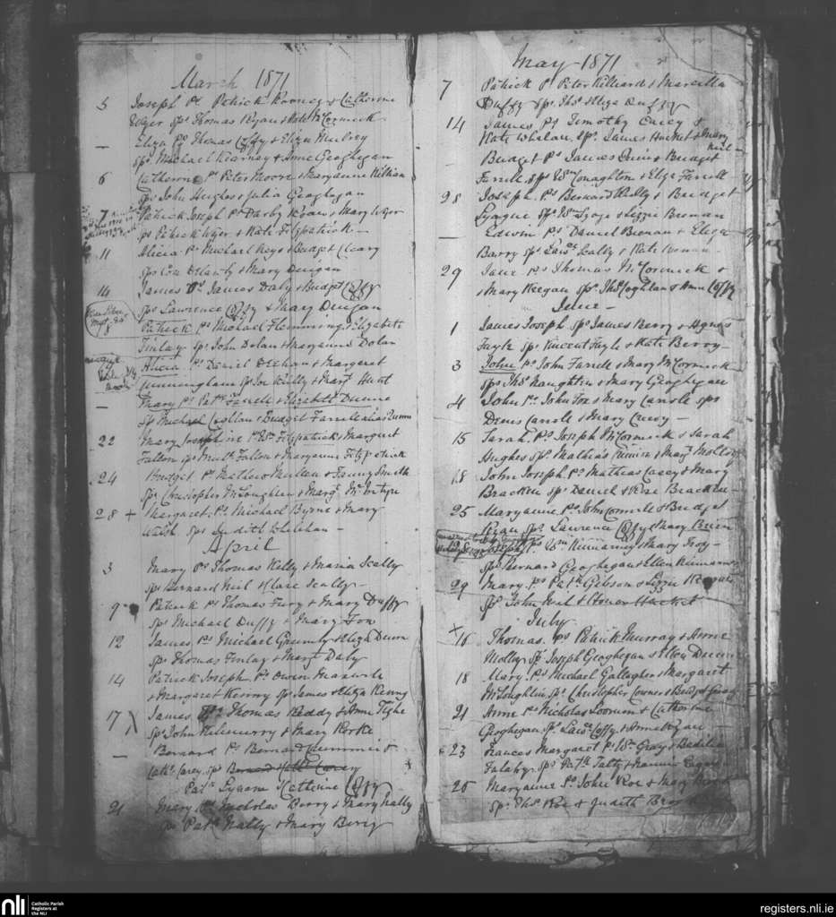 Kilbeggan; Contae Westmeath; Deoise Meath. Baptisms, Már. 1871 go dtí an Iúil 1871