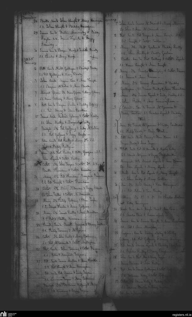 Kilbride and Mountnugent; County of Westmeath, Meath, Cavan; Diocese of Meath. Baptisms, Dec. 1834 to Mar. 1835