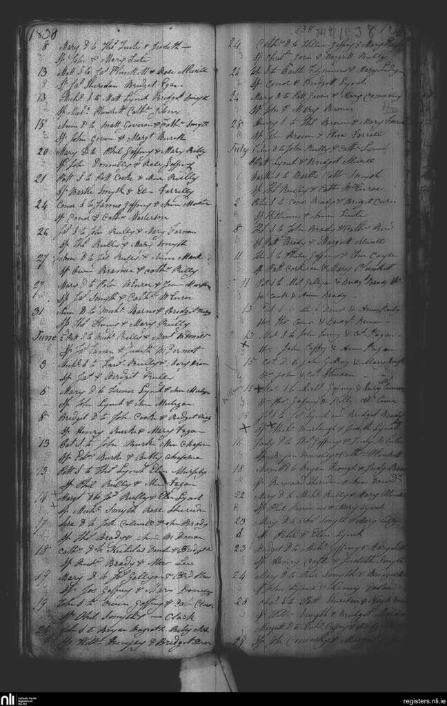 Kilbride and Mountnugent; County of Westmeath, Meath, Cavan; Diocese of Meath. Baptisms, May 1838 to July 1838
