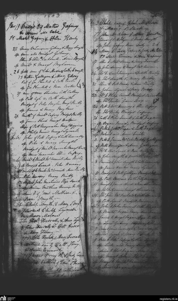 Kilbride and Mountnugent; County of Westmeath, Meath, Cavan; Diocese of Meath. Baptisms, Jan. 1843 to Apr. 1843
