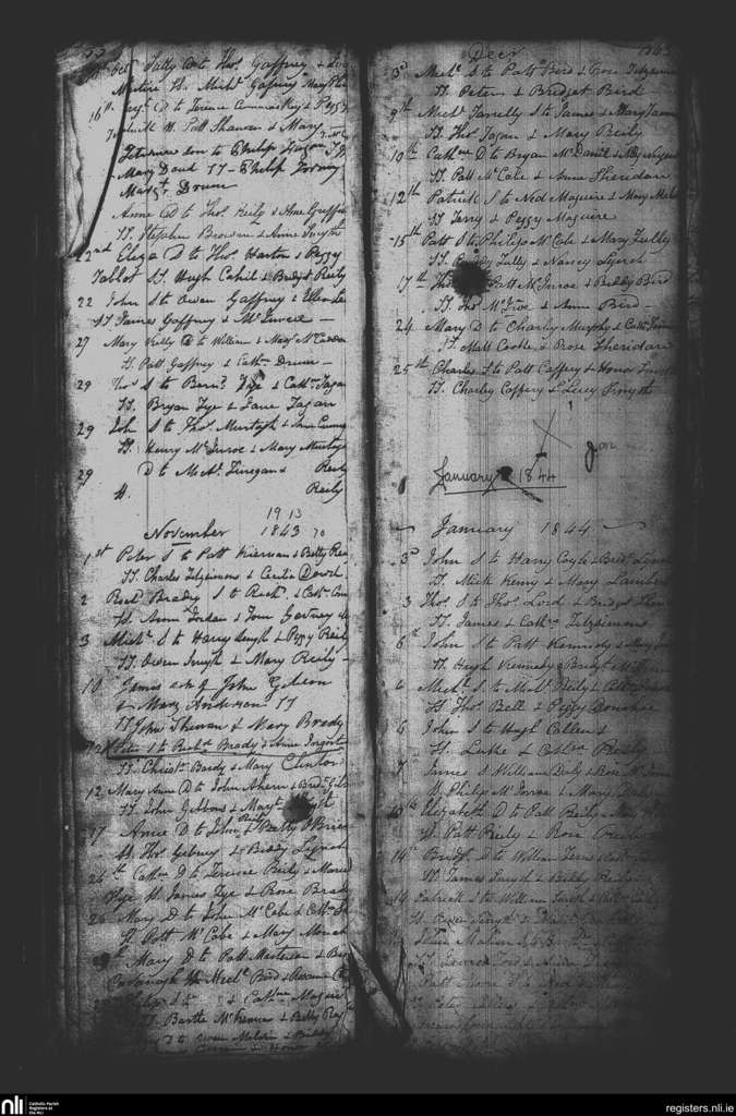 Kilbride and Mountnugent; County of Westmeath, Meath, Cavan; Diocese of Meath. Baptisms, Oct. 1843 to Jan. 1844