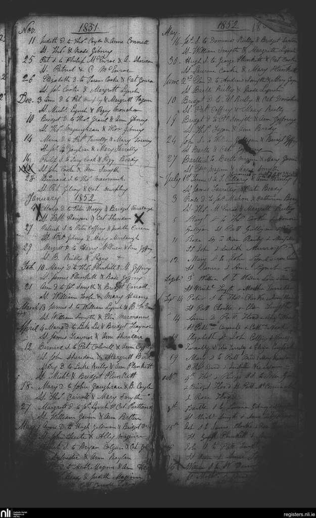 Kilbride and Mountnugent; County of Westmeath, Meath, Cavan; Diocese of Meath. Baptisms, Nov. 1851 to Oct. 1852