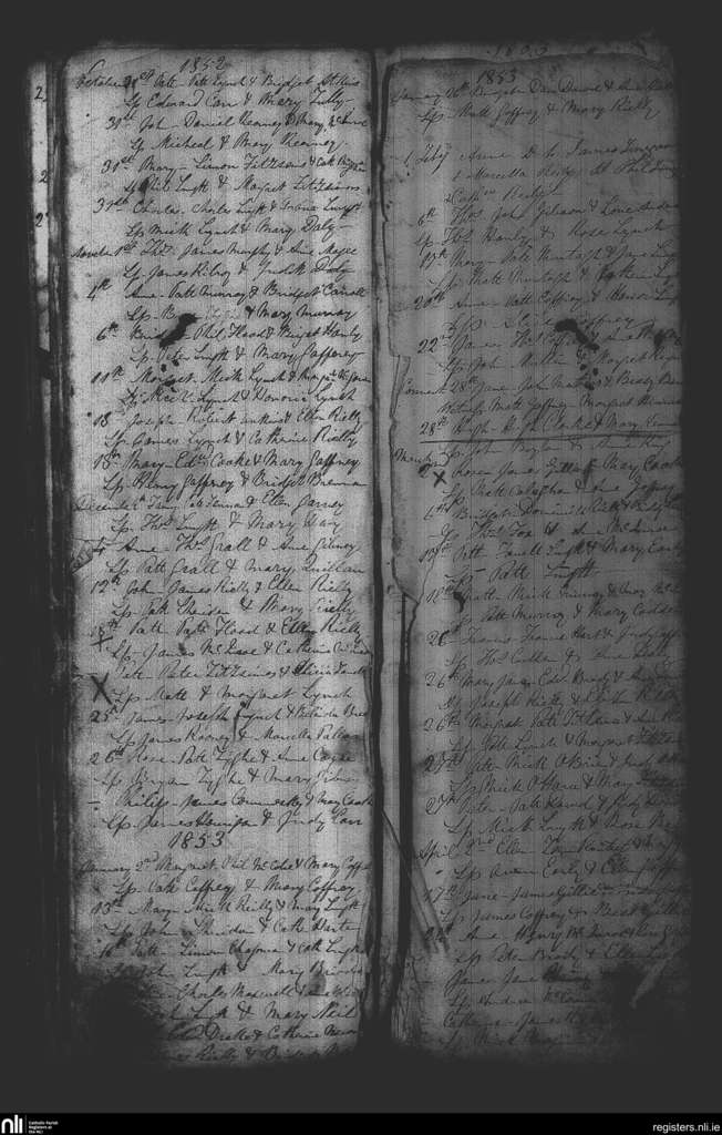 Kilbride and Mountnugent; County of Westmeath, Meath, Cavan; Diocese of Meath. Baptisms, Oct. 1852 to Apr. 1853