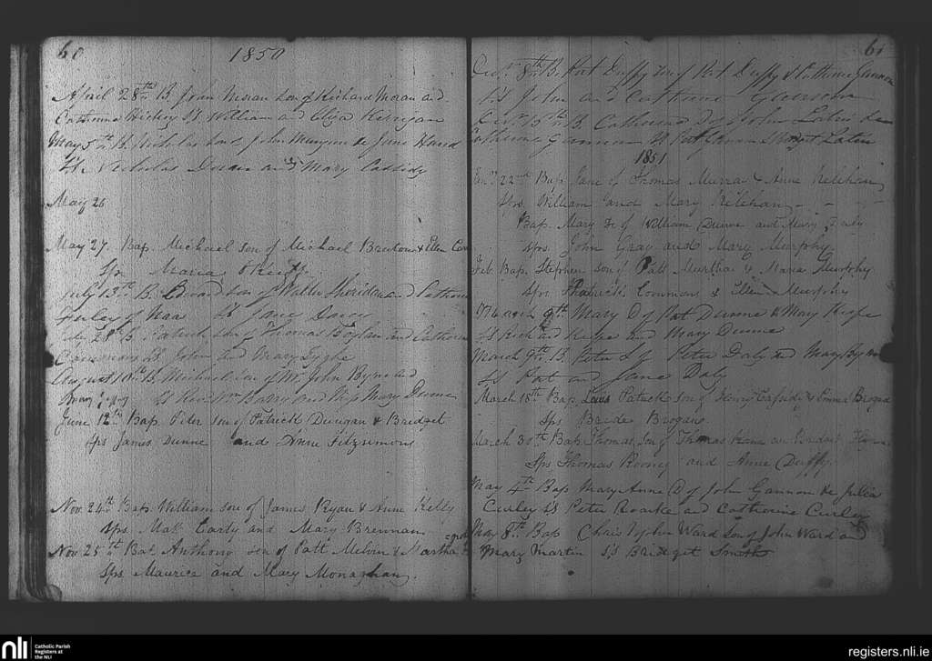 Kilcloon, Batterstown and Kilcock; County of Meath; Diocese of Meath. Baptisms, Apr. 1850 to May 1851