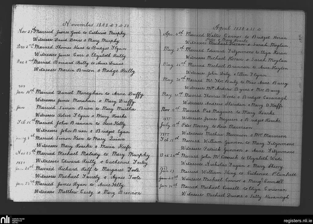 Kilcloon, Batterstown and Kilcock; County of Meath; Diocese of Meath. Marriages, Nov. 1848 to Jan. 1853