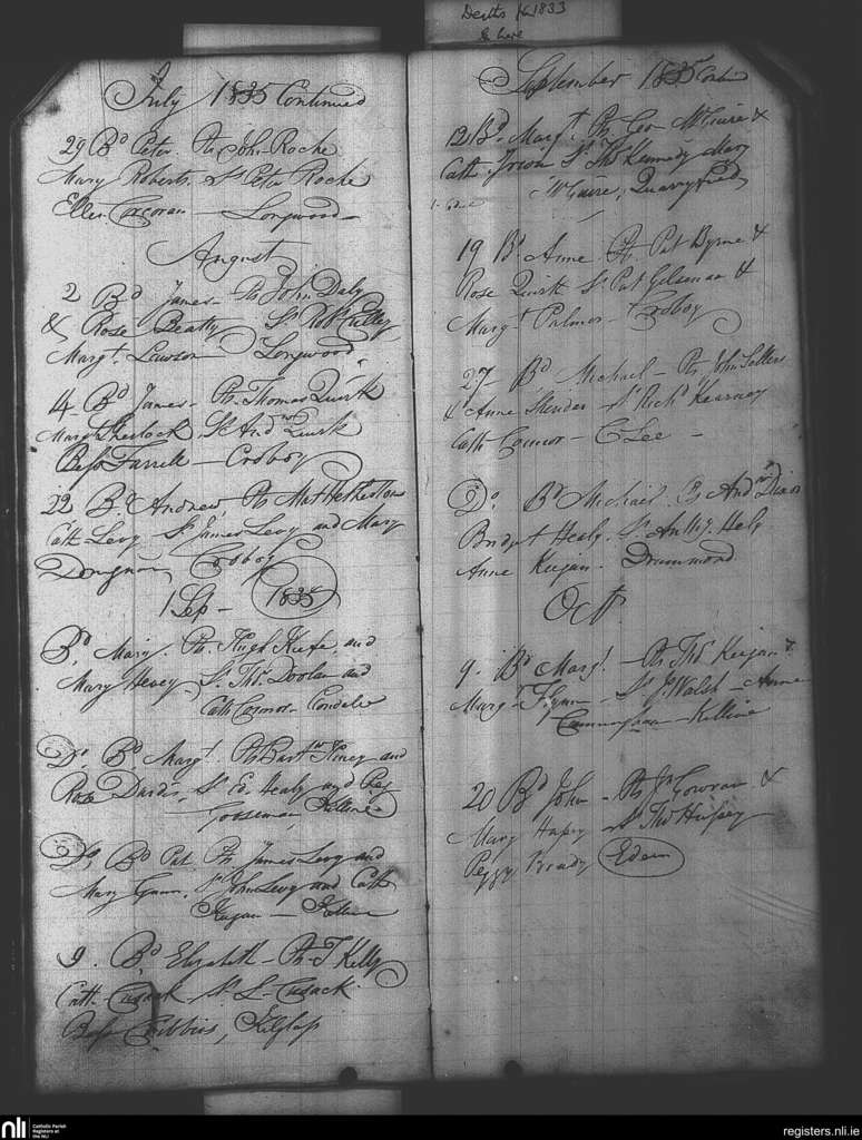 Killine; County of Meath; Diocese of Meath. Baptisms, July 1835 to Oct. 1835