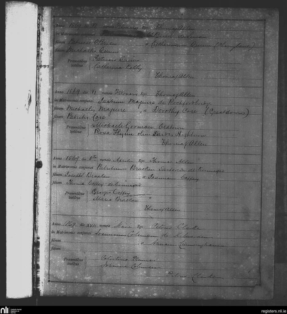 Kinnegad; County of Westmeath; Diocese of Meath. Marriages, Feb. 1869 to May 1869