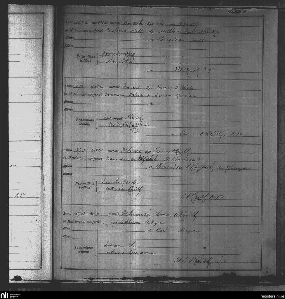 Kinnegad; County of Westmeath; Diocese of Meath. Marriages, Nov. 1872 to Feb. 1873