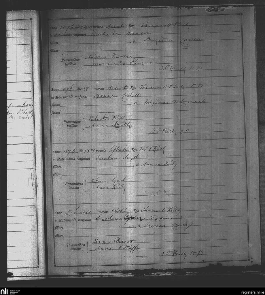 Kinnegad; County of Westmeath; Diocese of Meath. Marriages, Aug. 1876 to Oct. 1876