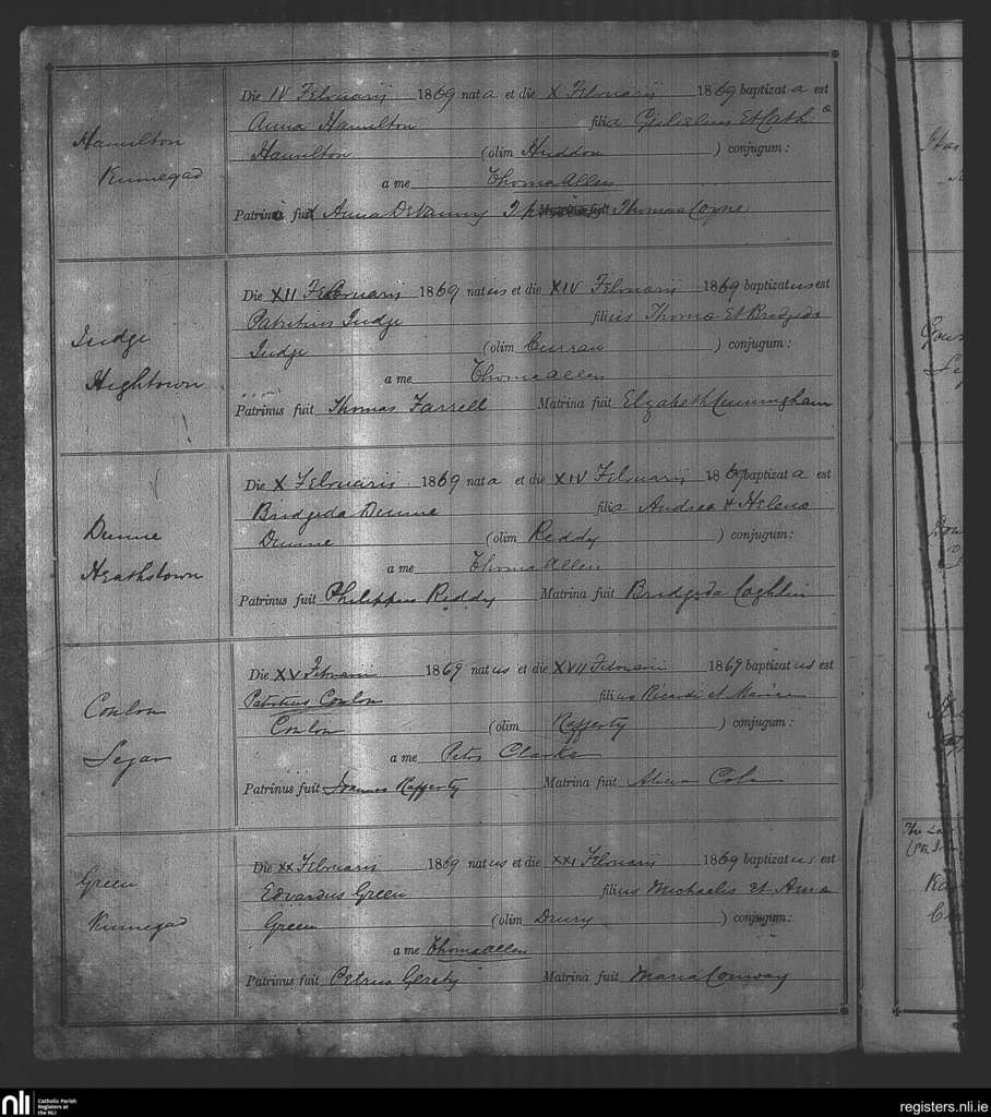 Kinnegad; County of Westmeath; Diocese of Meath. Baptisms, Feb. 1869