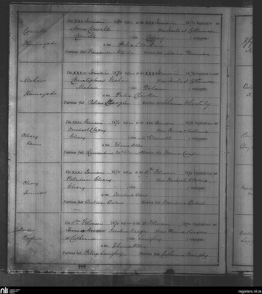 Kinnegad; County of Westmeath; Diocese of Meath. Baptisms, Jan. 1870 to Feb. 1870