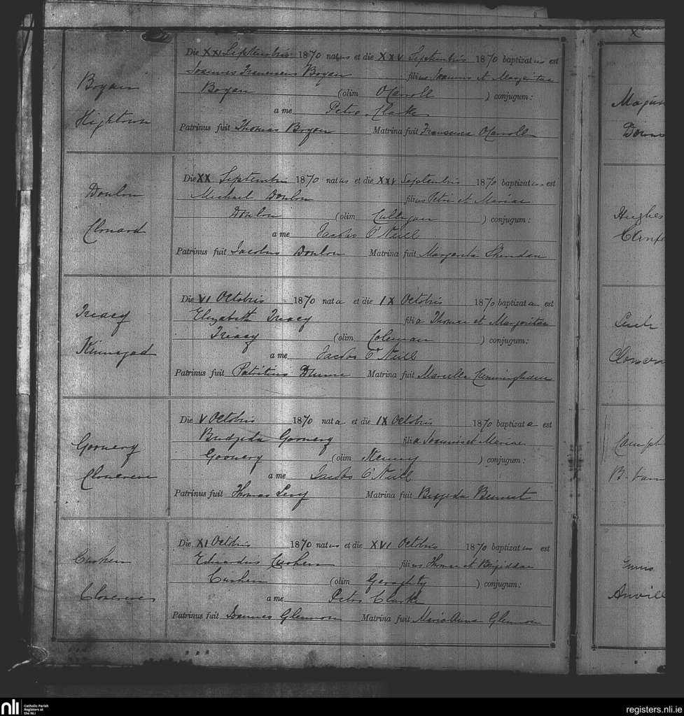Kinnegad; County of Westmeath; Diocese of Meath. Baptisms, Sep. 1870 to Oct. 1870