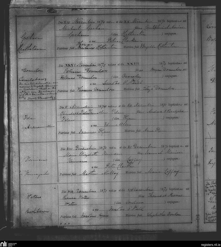 Kinnegad; County of Westmeath; Diocese of Meath. Baptisms, Nov. 1870 to Dec. 1870