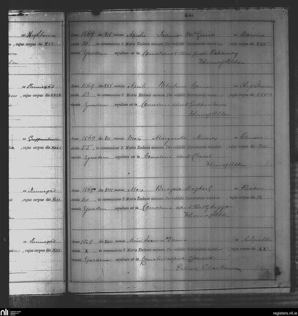 Kinnegad; County of Westmeath; Diocese of Meath. Deaths, Apr. 1869 to May 1869