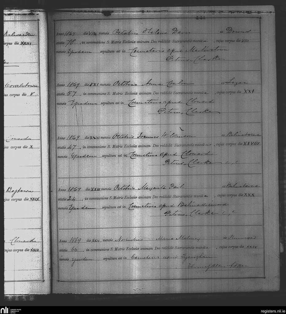 Kinnegad; County of Westmeath; Diocese of Meath. Deaths, Oct. 1869 to Nov. 1869