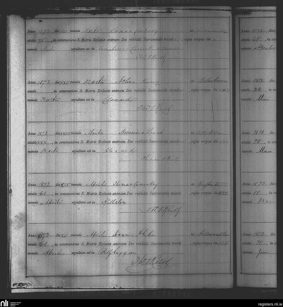 Kinnegad; County of Westmeath; Diocese of Meath. Deaths, Mar. 1872 to Apr. 1872