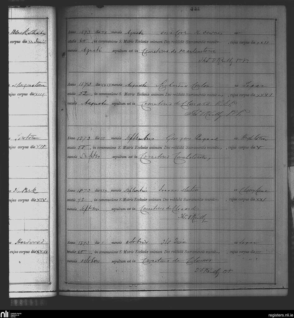 Kinnegad; County of Westmeath; Diocese of Meath. Deaths, Aug. 1873 to Oct. 1873